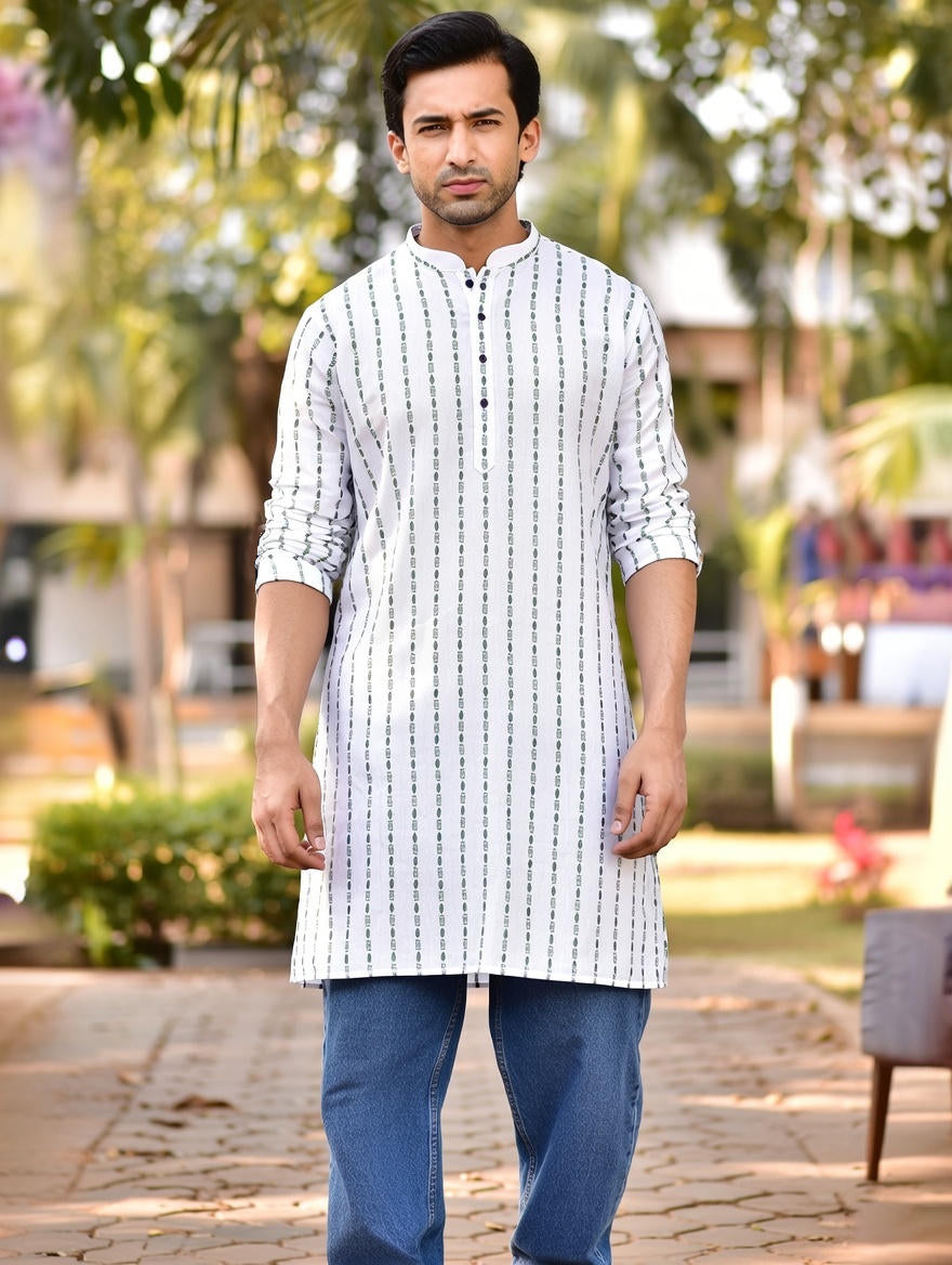 Add a vibrant touch to your traditional wardrobe with this stylish printed cotton kurta. Crafted from soft, breathable cotton, this kurta offers a perfect balance of comfort and charm. The all-over print brings a modern twist to ethnic wear, making it an ideal choice for festive occasions, casual get-togethers, or daytime events. Designed with a straight cut, mandarin collar, and full sleeves, this piece offers a refined yet relaxed look.
