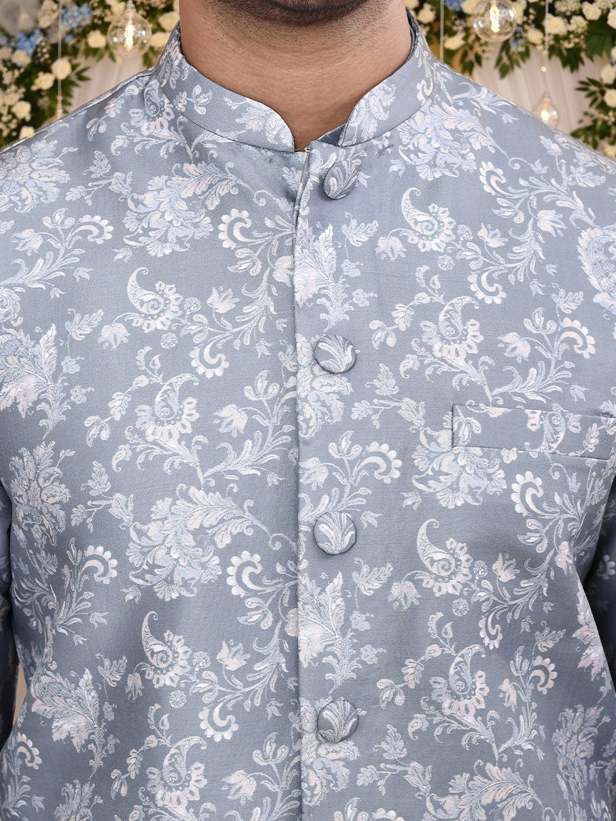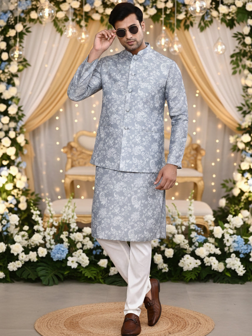 Elevate your ethnic style with our Men's Floral Printed Kurta & Jacket Set, a perfect blend of tradition and contemporary charm. This elegant ensemble features: