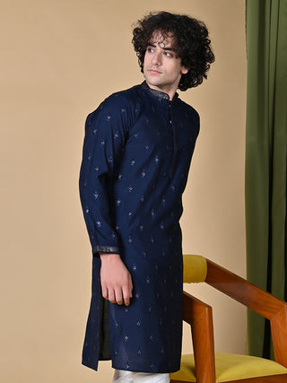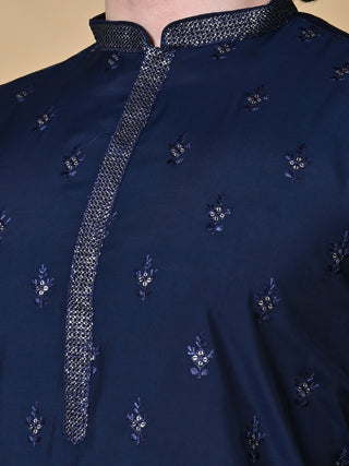 Men's Navy Blue Embroidered Mulberry Silk Kurta