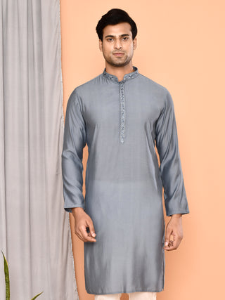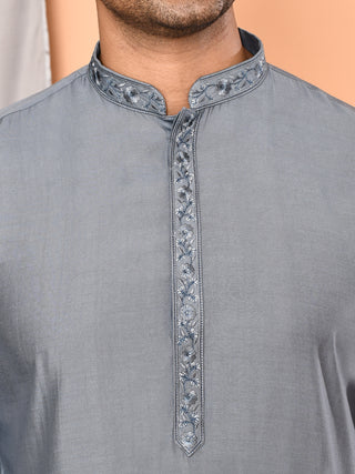 Men'n Grey Thread Worked Cotton Kurta